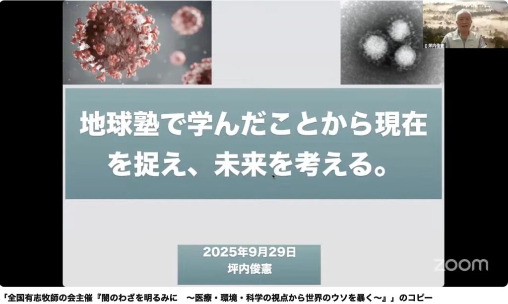 本会主催のオンラインセミナー「闇のわざを明るみに ~医療・環境・科学の視点から世界のウソを暴く~」が9月29日(月)19時~22時に開催され、86名の参加があった。講師の坪内俊憲氏は元WHO国際調査員であり獣医師という肩書を持ち、世界各国の自然保全に関わる業務を行い、WHOや製薬会社勤務などの国際的で多様な職務経験を活かし、幅広い分野への提言などの講演活動を行われている。